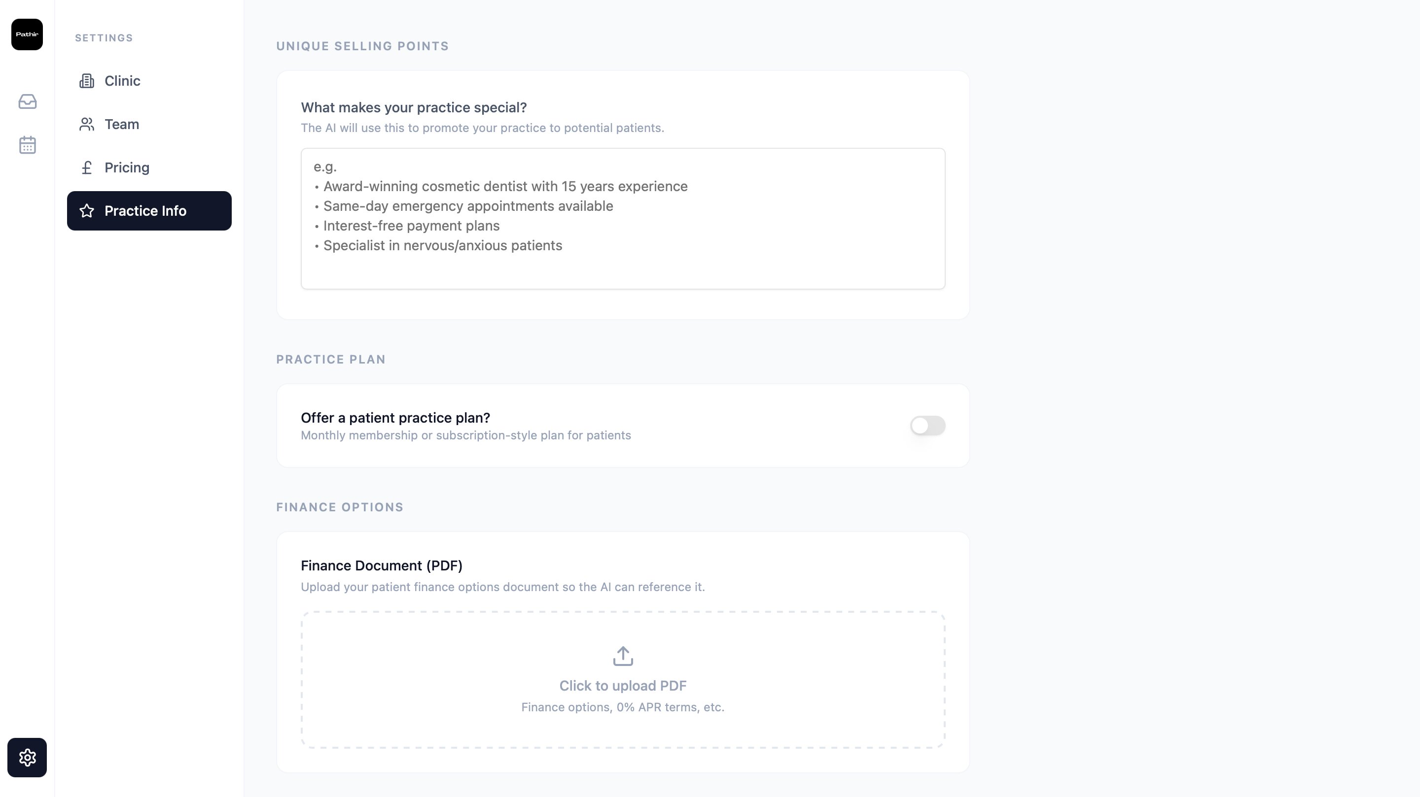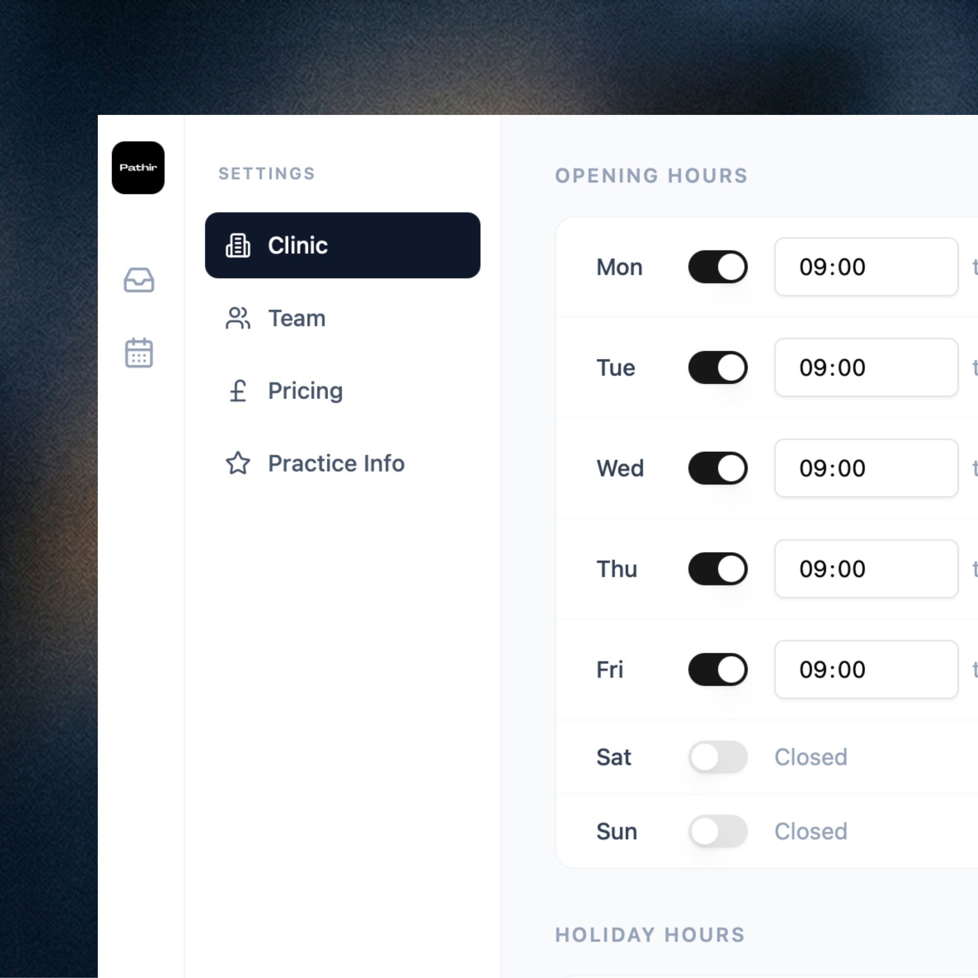 If anything changes in your clinic, just log in and update it — no support call needed.